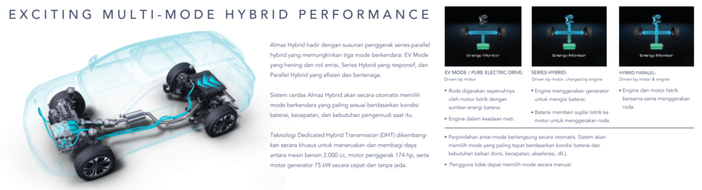 Wuling Almaz Hybrid dilengkapi dengan teknologi regenerasi energi yang memungkinkan mobil untuk mengisi kembali baterai saat mengerem atau menurunkan kecepatan. Selain itu, mobil ini juga dilengkapi dengan sistem stop-start yang mematikan mesin saat mobil berhenti dan menyalakannya kembali saat dalam kondisi siap untuk dijalankan.